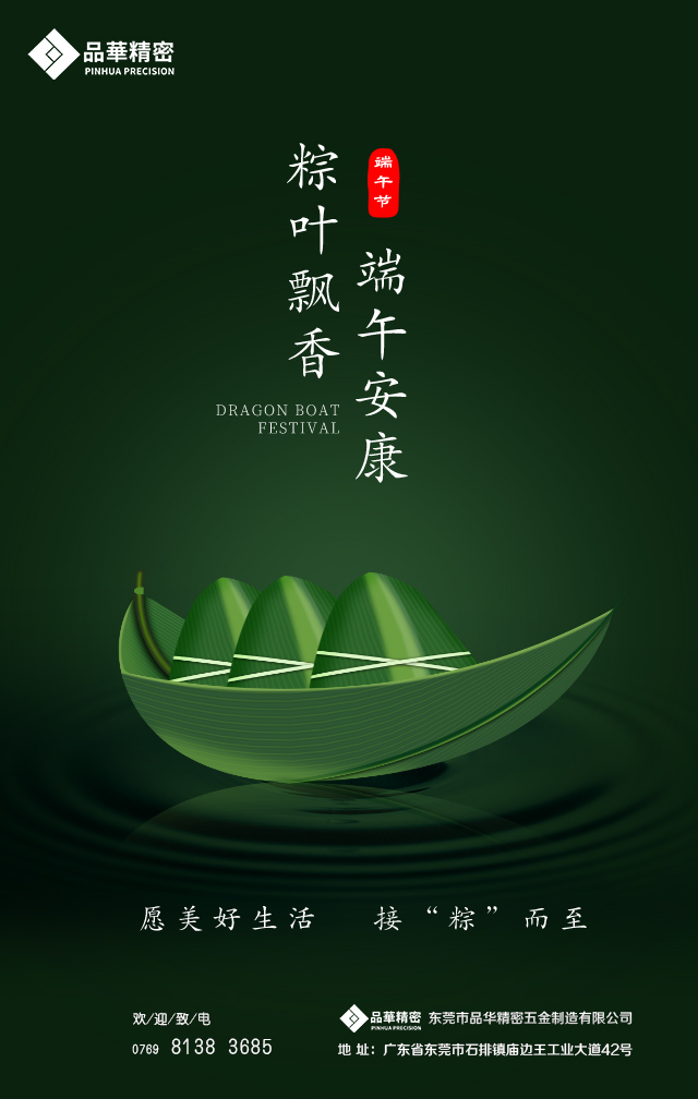 端午與春節、清明、中秋并稱為中國四大傳統節日,“端午節”這一詞更早出現了于西晉的《風土記》: ”仲夏端午謂五月五日也,俗重此日也,與夏至同。”后因戰國時期的楚國詩人屈原在五月五日跳汨羅江自盡,人們亦將端午節作為紀念屈原的節日。在濃濃的粽香飄來之際,品華精密全體員工祝各位新老客戶作業順當,萬事如意,端午安康!